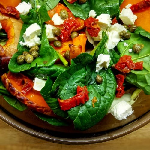 A simple and delicious salad of roasted butternut, baby spinach, feta and sun-dried tomatoes